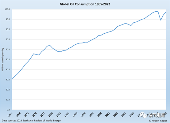 1965-2022 年全球石油消费。