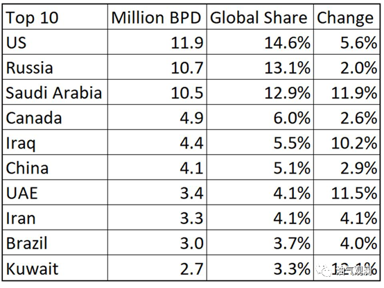 以下是 2022 年原油和凝析油产量排名前十的国家: