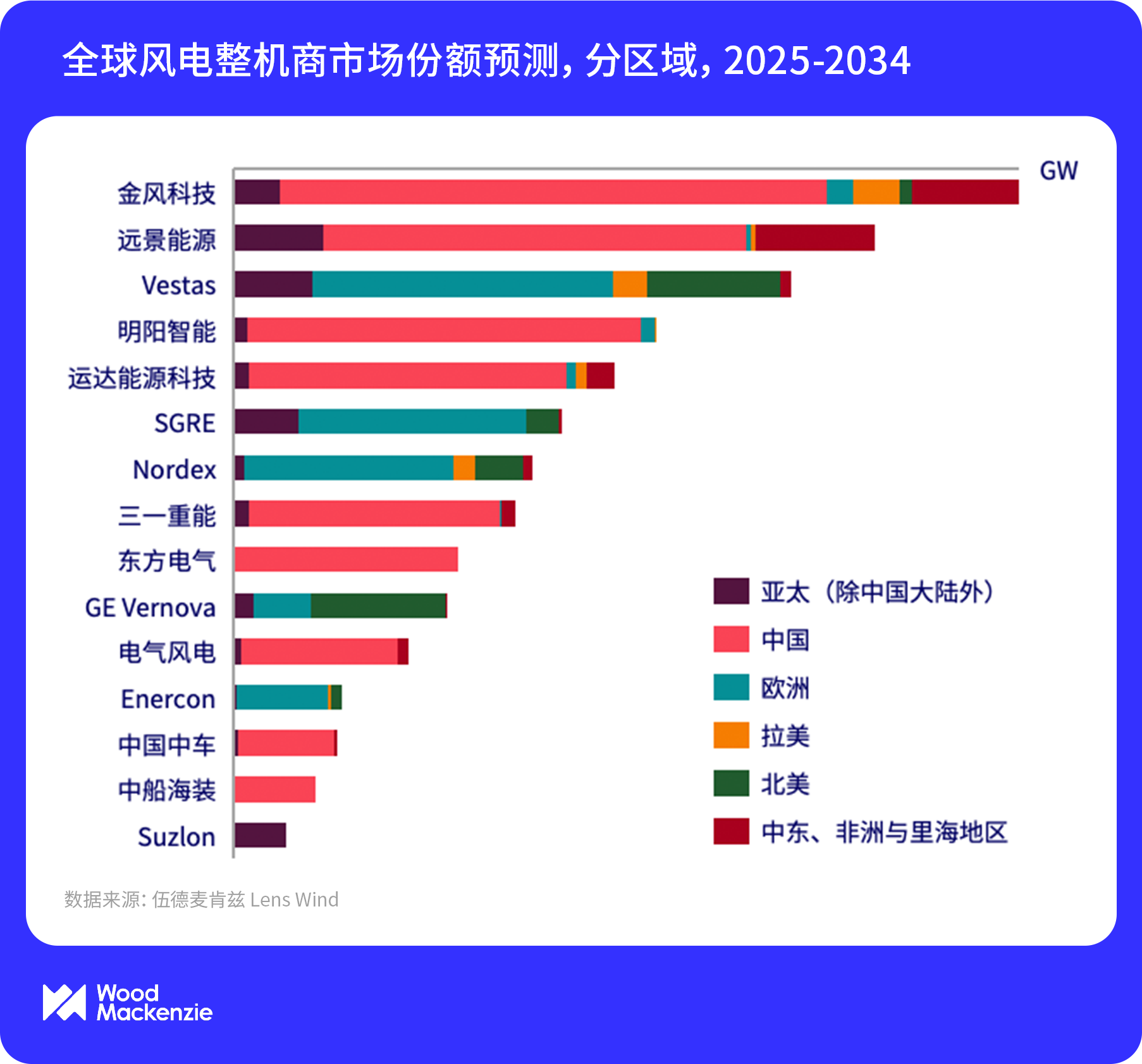 2025-2034年期间,前十大风电整机商将占据全球风电新增并网装机总量的98%,其中,中国企业将占据全球前五强中的四席。