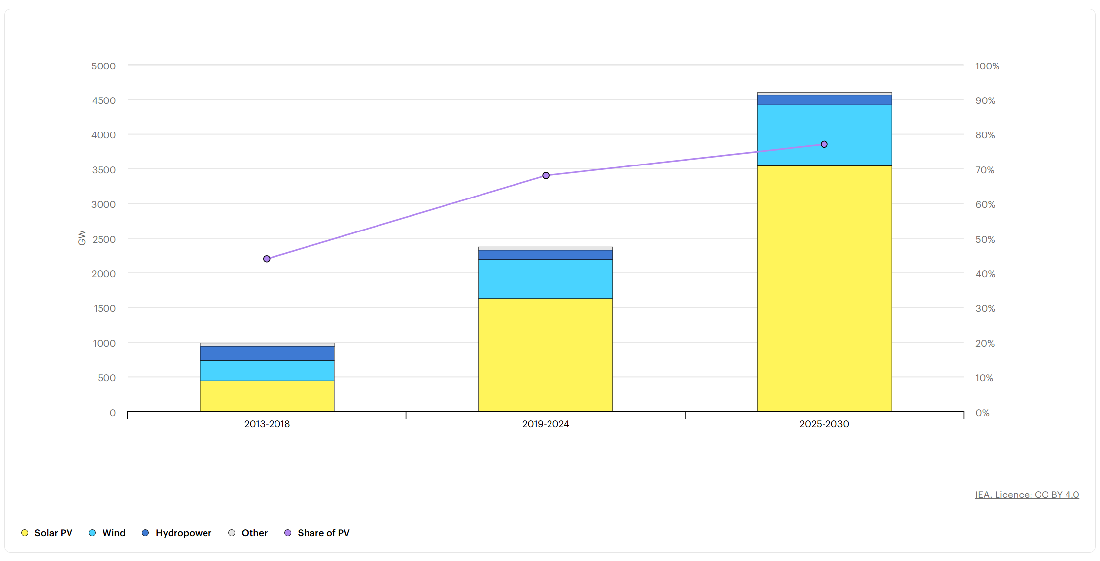 按技术领域划分的可再生能源发电容量增长及太阳能光伏占比(2013-2030年)