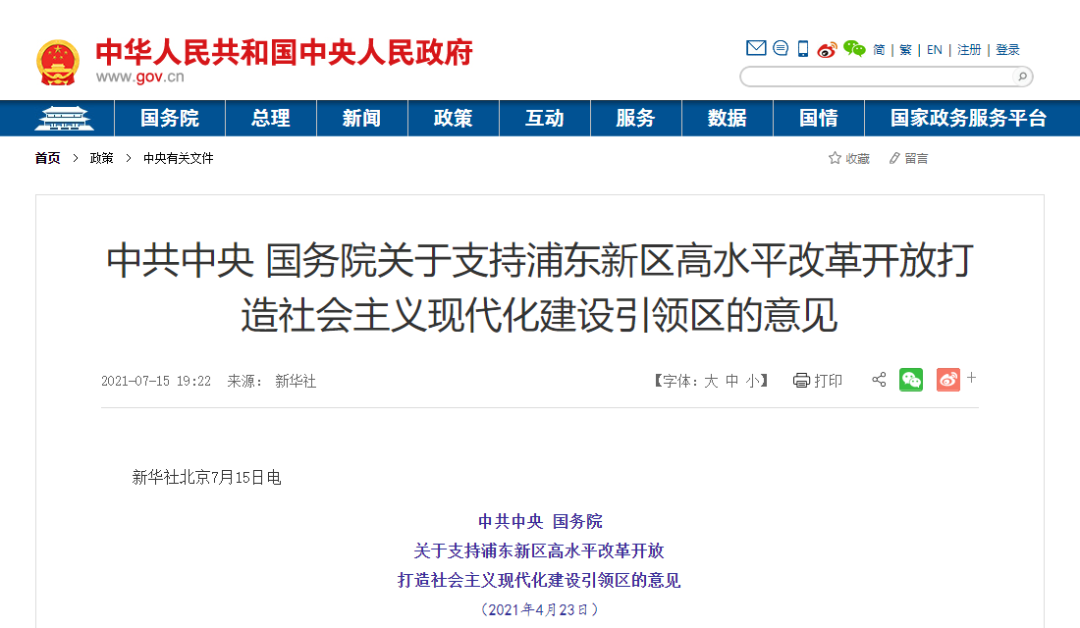 2021年7月15日,《中共中央 国务院关于支持浦东新区高水平改革开放打造社会主义现代化建设引领区的意见》发布。意见提出10个方面、27条内容。
