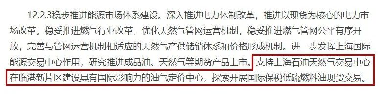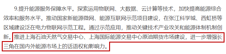 2020年1月10日,在上海市政府发布的《上海市贯彻实施方案 》中,明确要求“推进上海石油天然气交易中心、上海国际能源交易中心原油期货市场建设,进一步增强长三角在国内外能源市场上的话语权和影响力。”