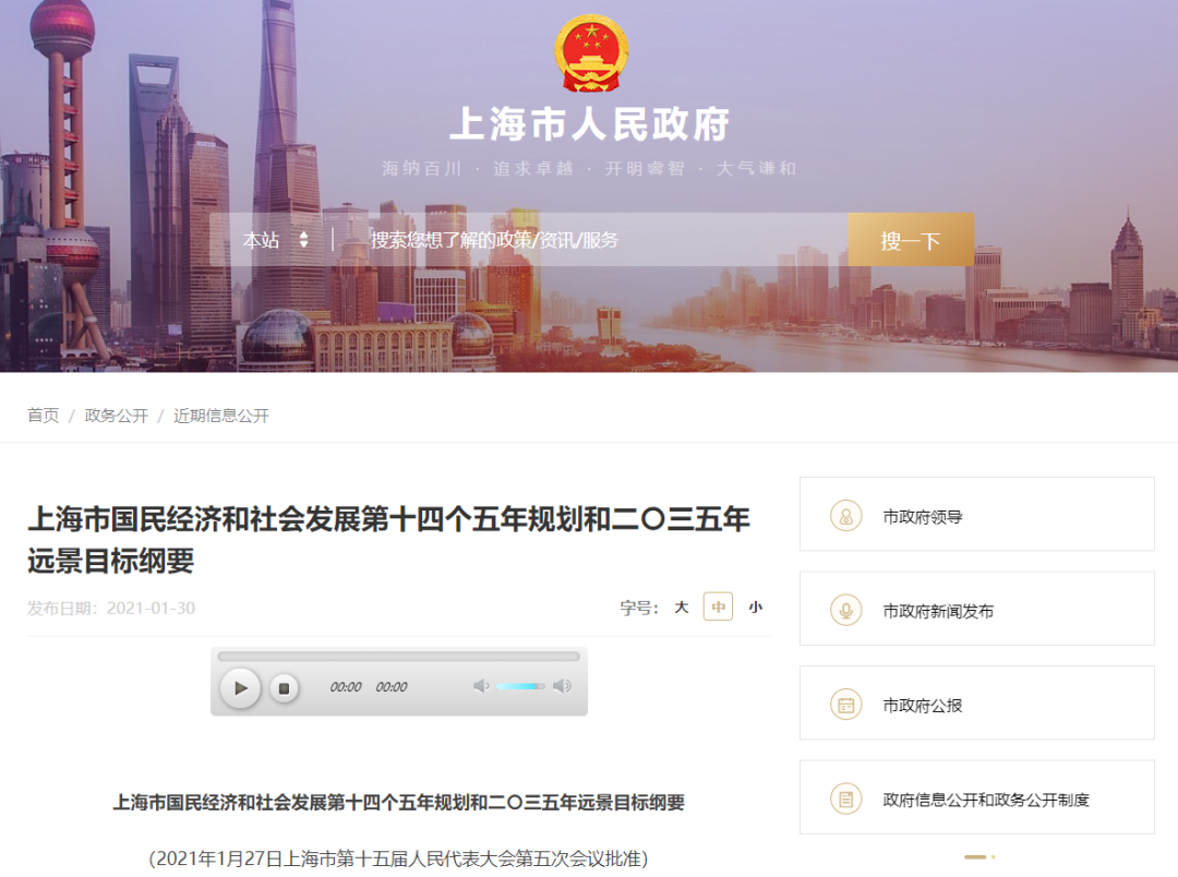 2021年1月30日,上海市十五届人大五次会议批准的《上海市国民经济和社会发展第十四个五年规划和二〇三五年远景目标纲要》正式公布!