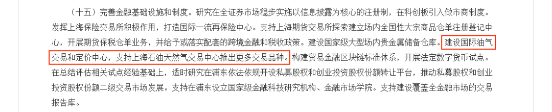 2021年7月15日,《中共中央 国务院关于支持浦东新区高水平改革开放打造社会主义现代化建设引领区的意见》发布,要求浦东新区增强全球资源配置能力,服务构建新发展格局;提出“建设国际油气交易和定价中心,支持上海石油天然气交易中心推出更多交易品种。”