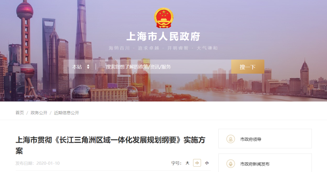 为深入实施《长江三角洲区域一体化发展规划纲要》,进一步发挥上海核心城市功能和龙头带动作用,推动国家战略更好贯彻落实,2020年1月10日,上海市印发《上海市贯彻实施方案 》。
