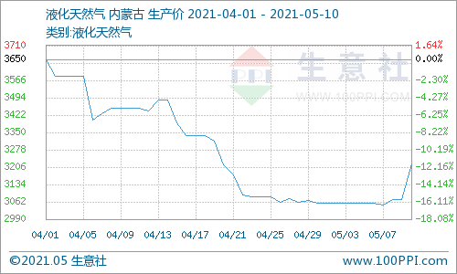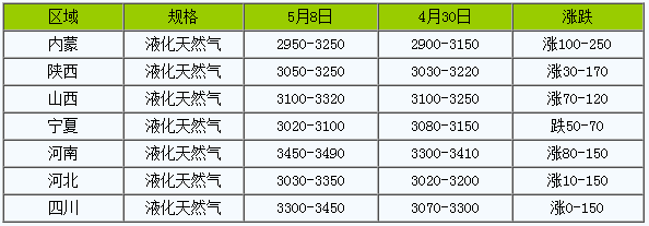 5月8日国内液化天然气市场反弹上涨,内蒙地区2950-3250元/吨,陕西地区3050-3250元/吨,山西地区3100-3320元/吨,宁夏地区3020-3100元/吨,河南地区3450-3490元/吨,河北地区3030-3350元/吨,四川地区3300-3450元/吨,各地液价普遍上调。