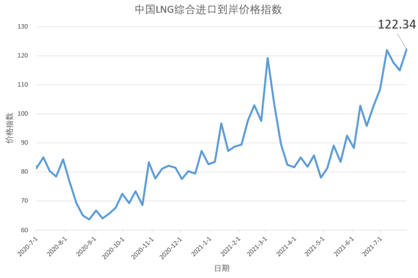 7月28日,海关总署全球贸易监测分析中心和上海石油天然气交易中心联合发布的中国LNG综合进口到岸价格指数显示,7月19日-25日,中国LNG综合进口到岸价格指数为122.34(C.I.F,不含税费、加工费),环比上涨6.32%,同比上涨45.10%。