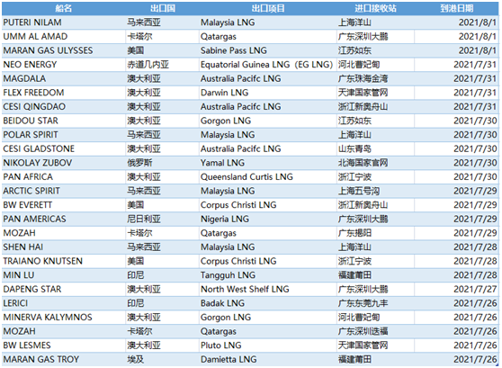 表1:7月26日-8月1日中国LNG进口详情预测