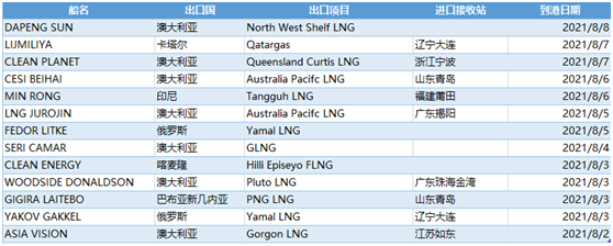 表2:8月2日-8月8日中国LNG进口详情预测