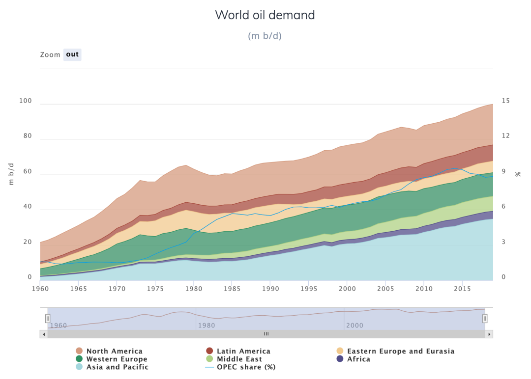 世界石油需求(来源:OPEC《2020年年度统计公报》)