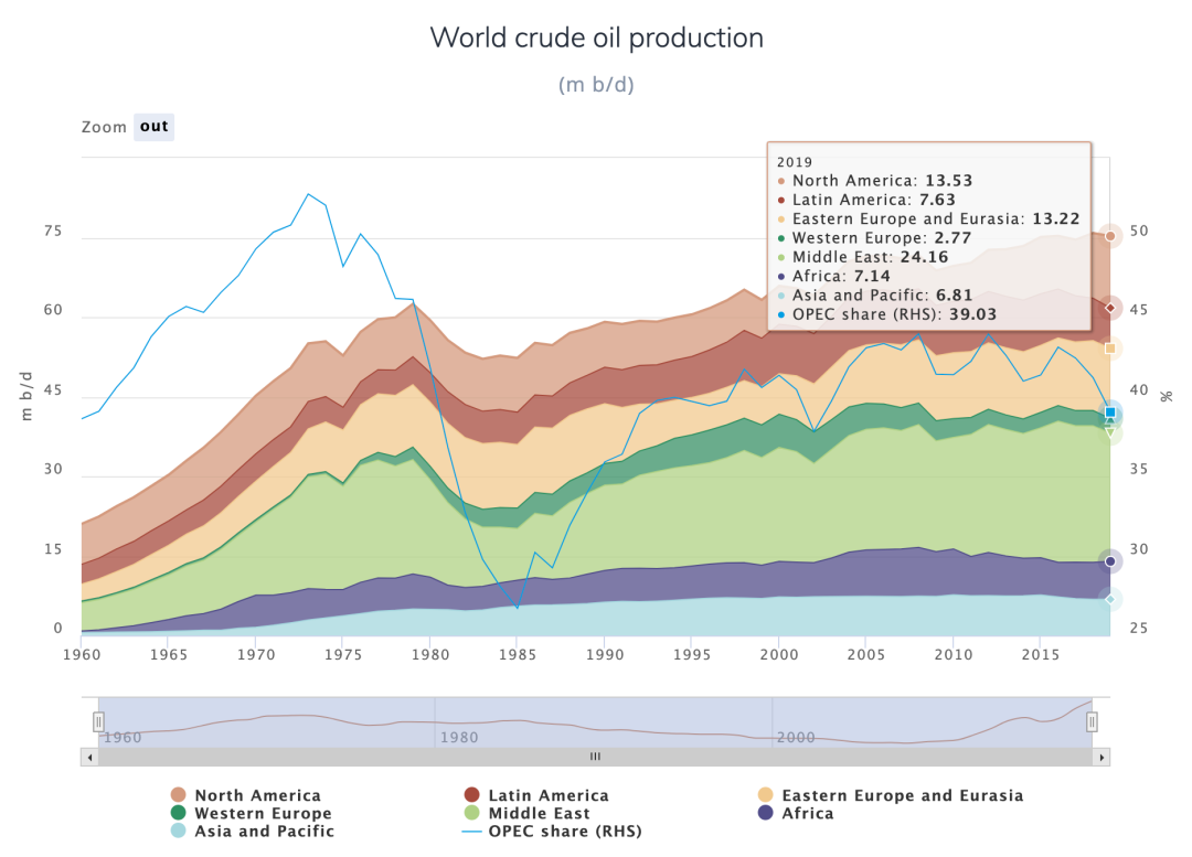 世界原油产量(来源:OPEC《2020年年度统计公报》)