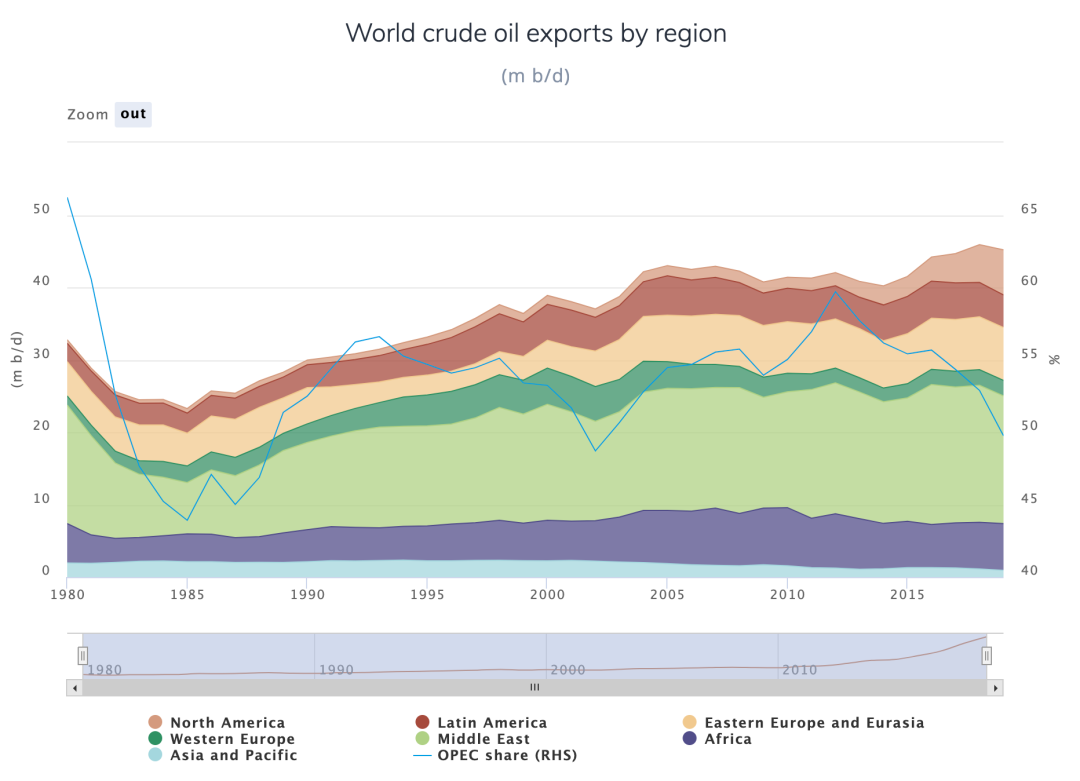 世界各地区原油出口(来源:OPEC《2020年年度统计公报》)