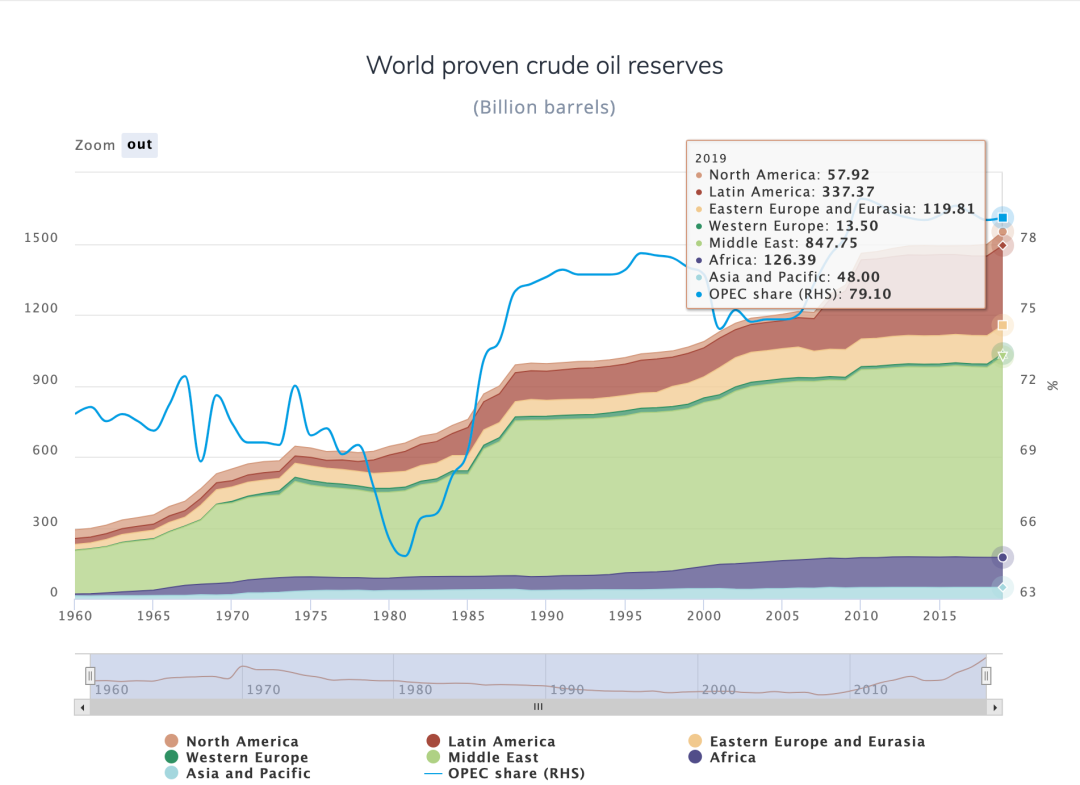 世界探明的原油储量(来源:OPEC《2020年年度统计公报》)