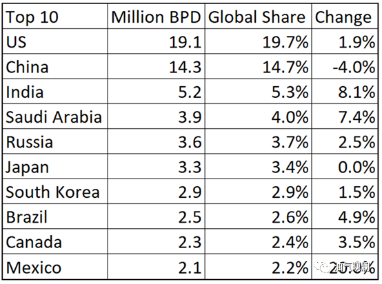 美国仍然是世界上最大的石油消费国,2022 年的平均石油消费量为 1910 万桶/日。中国位居第二,为1430 万桶/日,是十大消费国中唯一一个报告石油消费量比2021 年有所下降的国家。前十名国家的平均消费量增幅为 4.6%。